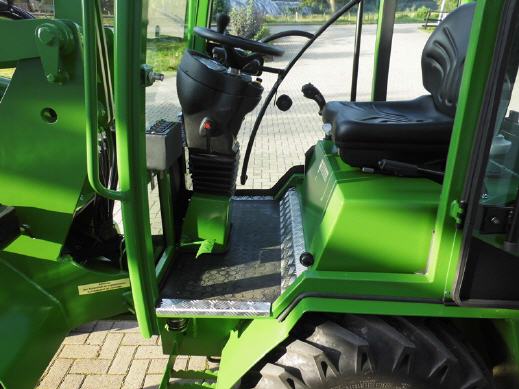 Besonders großen Wert wurde auf eine perfekte Rundumsicht gelegt. Auch bei voll ausgehobener Schwinge ist die Sicht auf die Arbeitsgeräte sehr gut. Das getönte Sicherheitsglas verhindert wirkungsvoll ein zu starkes Aufheizen der Kabine bei starker Sonneneinstrahlung. Der extra breite Einstieg wurde für häufiges Auf und Absteigen konzipiert. Die Ergonomie lässt keine Wünsche offen, alle Bedienelemente sind da wo man sie erwartet. Die beiden großen weit geöffneten Glastüren lassen sich auch in geöffneter Stellung sicher arretieren, sodass man bei Bedarf auch mit vollständig geöffneten Türen fahren und arbeiten kann. Auch an eine einfache Wartung aller Aggregate wurde gedacht, so sind Motor, alle Filter, Ölpeilstab, Kühler, Einfüllstutzen,usw., nach aufklappen der Haube bestens zu erreichen.
